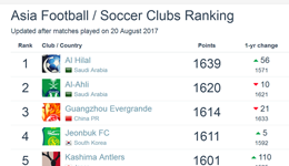 2017亚洲球队排名 恒大第3上港第17北京时间8月22日消息,足球数据统计网站“footballdatabase”发布了新一期世界足球俱乐部排行榜。在亚洲俱乐部方面,广州恒大以1614分排名亚洲第3位,在世界范围内排名第88位。...