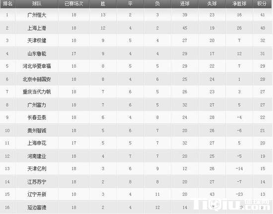 中超积分榜:三镇领跑 河北队取首胜广州城0分垫底