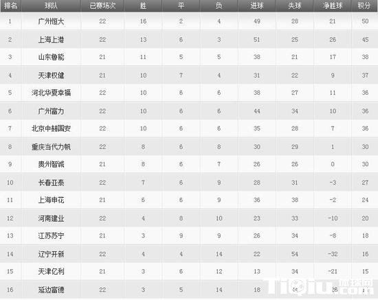 2017中超积分榜射手榜 恒大依旧领先上港5分