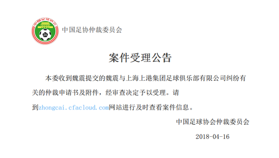 中国足协仲裁委员会官方写到:本委收到魏震提交的魏震与上海上港集团足球俱乐部有限公司纠纷有关的仲裁申请书及附件,经审查决定予以受理。请 到zhongcai.cfacloud.com网站进行及时查看案件信息。