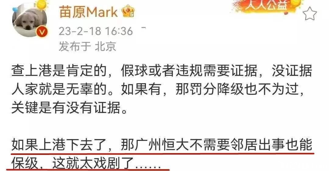 而苗原则表示,查上港是肯定的,假球或者违规需要证据,没有证据,人家就是无辜的,如果有,那罚分降级也不为过,如果上港下去了,那广州恒大不需要邻居出事也能保级,这就太戏剧了。