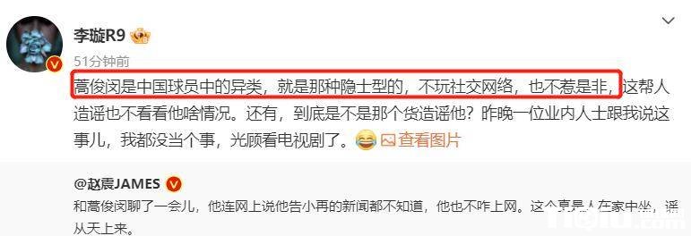 李轩还通过社交媒体评价蒿俊闵,称三哥是中国球员中的隐士,属于另一个国家。