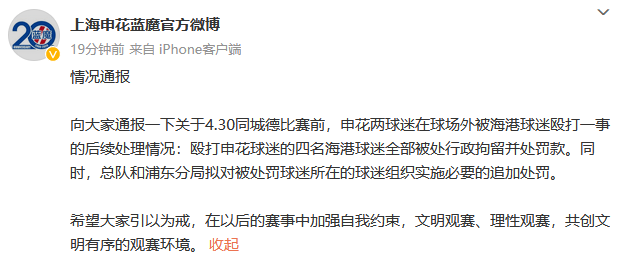 向大家通报一下关于4.30同城德比赛前,申花两球迷在球场外被海港球迷殴打一事的后续处理情况:殴打申花球迷的四名海港球迷全部被处行政拘留并处罚款。同时,总队和浦东分局拟对被处罚球迷所在的球迷组织实施必要的追加处罚。