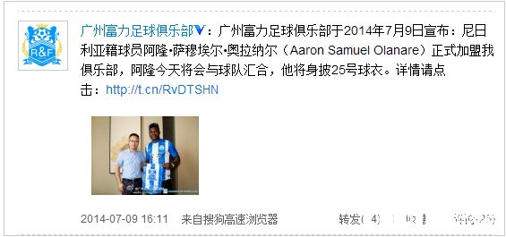 ¡¡¡¡¸»Á¦¹Ù·½Î¢²©Ð´µÀ£º“¹ãÖݸ»Á¦×ãÇò¾ãÀÖ²¿ÓÚ2014Äê7ÔÂ9ÈÕÐû²¼£ºÄáÈÕÀûÑǼ®ÇòÔ±°¢Â¡·ÈøÄ°£¶û·°ÂÀÄɶû(Aaron Samuel Olanare)Õýʽ¼ÓÃËÎÒ¾ãÀÖ²¿£¬°¢Â¡½ñÌ콫»áÓëÇò¶Ó»ãºÏ£¬Ëû½«ÉíÅû25ºÅÇòÒ¡£”