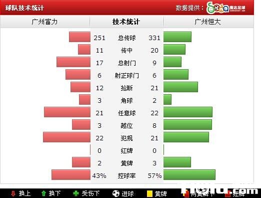 从数据上看,富力在攻势上反倒是占据着上风,这从他们射门17-9上便可看出,射正上两队则以6-6平分秋色。控球率上,恒大则明显占优,以57%-43%高出对手,也可看出恒大掌控节奏的能力更强。