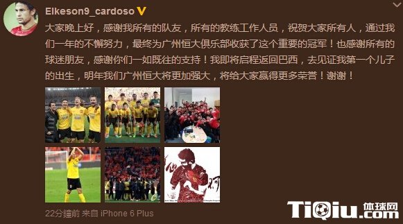 就在众人还在为埃尔克森的去留热议不断之时,当事人“小熊”在离开中国发了一条微博,巴西人称:“大家晚上好,感谢我所有的队友,所有的教练工作人员,祝贺大家所有人,通过我们一年的不懈努力,最终为广州恒大俱乐部收获了这个重要的冠军!也感谢所有的球迷朋友,感谢你们一如既往的支持!我即将启程返回巴西,去见证我第一个儿子的出生,明年我们广州恒大将更加强大,将给大家赢得更多荣誉!谢谢!”