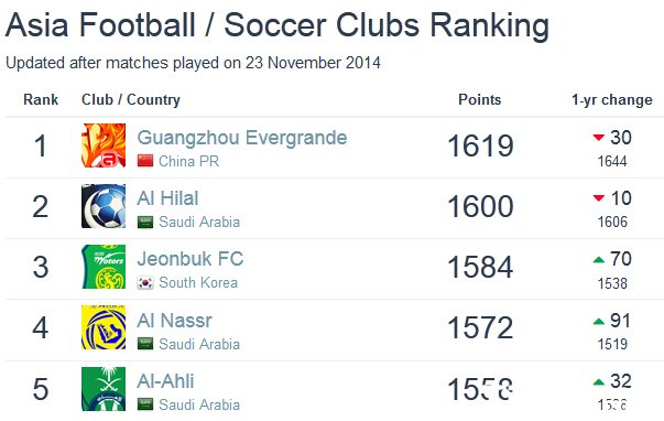 在最新一期的排名中,中国四连冠广州恒大积1619分排名世界第72,仅以一份的劣势位于德甲球队霍芬海姆之后,排在恒大之后的是两支英超球队斯旺西以及西汉姆联。此外,亚洲紧随恒大身后的球队有沙特沙特阿尔希拉尔(第83位)、韩国全北现代(第99位)。浦项制铁,阿联酋阿尔艾因,穆里奇所效力的卡塔尔阿尔萨德,韩国首尔FC,伊朗德黑兰独立,泰国武里南联,日本大阪钢巴,鹿岛鹿角等。新科亚冠冠军西悉尼流浪者队,在本期榜单中狂升660位,位列澳洲第一,但在世界排名上仅列第438位。