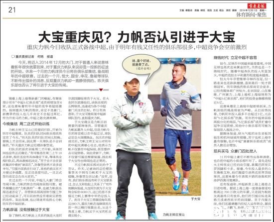 国内足球 时间:2014-12-01 10:21来源:未知编辑:浅月【导读】今天,将迈入2014年12月的大门,对于普通人来说意味着新年很快就要到来,对于重庆力帆队来说却是一段新的征途的开始。休息一个月的力帆球员今日将在俱乐部集结,备战明年的中超联赛。过去的一个月,恒大、国安、申花、鲁能等球队不断传出强补的消息,反观重庆力帆却一直静悄悄的。昨天俱乐部也否认了将引进于大宝的传闻。