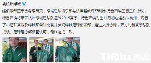 杭州绿城俱乐部在其官方微博中写道,“经俱乐部董事会考察研究,绿城足球俱乐部与法国籍教练菲利浦·特鲁西埃签署工作协议,特鲁西埃将带领杭州绿城足球队征战2015赛季。特鲁西埃先生11月初应邀前来杭州,观看了中超联赛以及绿城预备队比赛并参观绿城足球俱乐部,经过交流协商,双方对新赛季球队成绩、足球理念都相互认可,最终达成一致。”