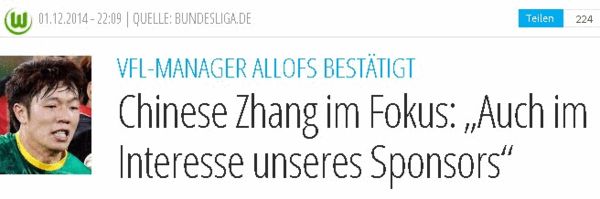 国内足球 时间:2014-12-02 16:34来源:未知编辑:浅月【导读】沃尔夫斯堡中喜欢张稀哲,这已经不是什么新闻了。尽管曾有媒体认为这是沃尔夫斯堡为开发中国市场而策划的营销活动,但俱乐部经理阿洛夫斯公开驳斥了这一说法,他曾直言引进张稀哲与市场活动无关。然而,当地时间12月1日,阿洛夫斯在接受德甲官方网站的采访时突然改变了口风,他坦言狼堡看上张稀哲首先是因为实力,但与此同时,这笔交易也符合狼堡的母公司——大众汽车在中国的市场利益。