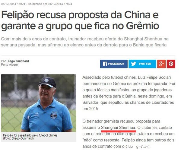 根据巴西媒体《环球体育》刚刚更新的消息,就在上周日,面对着来自中超豪门上海绿地申花俱乐部的天价邀约,现任巴西劲旅格雷米奥队主帅的斯科拉里只是不假思索地回复了一个“NO”,因为这位曾在2002年带领巴西队问鼎世界杯冠军的功勋主帅与格雷米奥俱乐部还有两年的合同在身,而且他本人也更希望留在格雷米奥继续执教,而根据格雷米奥俱乐部工作人员的描述:“斯科拉里昨天(上周日)直接拒绝了来自中国的邀请。”