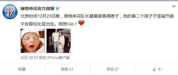 国内足球 时间:2014-12-25 16:15来源:未知编辑:浅月【导读】北京时间12月23日晚间,申花队长莫雷诺第二个孩子于圣诞节前夕在哥伦比亚出生。申花官方微博也特发微博为莫雷诺送上祝福。