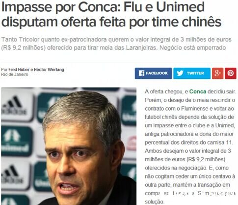 弗鲁米嫩塞俱乐部陷入财政危机后,球队核心孔卡就流入转会市场,这也让弗鲁米嫩塞对他的去留问题十分上心。早有消息称,负责孔卡薪水的赞助商Unimed总裁巴罗什透露,为孔卡报价的俱乐部有科林蒂安、有弗拉门戈,还有中国的俱乐部,并且强调孔卡并不排除会回到中国踢球。随着事情进展,中超这家俱乐部已浮出水面,正是上海上港队。