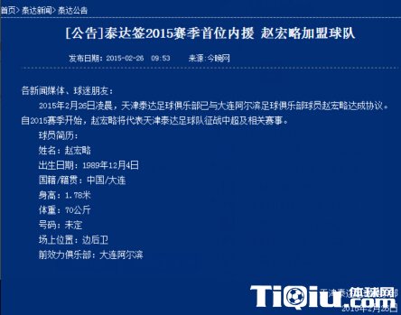 国内足球 时间:2015-02-26 16:06来源:体球网编辑:浅月【导读】北京时间今天上午,天津泰达官网宣布前阿尔滨球员赵宏略正式加盟球队。这是天津泰达2015赛季成功引进的首个内援。球队官方公告具体如下: