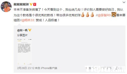 针对祝一帆的这番言论,鲁能球员戴琳转发了祝一帆的微博,并给予了驳斥。戴琳写到:“本来不准备发微博了!今天看到这个,我也说几句!评价别人需要做好自己,我认为这个教练是个很优秀的教练!带出很多优秀的球员。”值得一提的是,在贾秀全执教U-19国青期间,当时曾对初出茅庐的戴琳青睐有加。