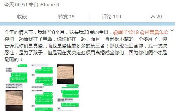 “今年的情人节,我怀孕8个月,这是我30岁的生日,杜文辉、闪嘉晨你们一起给我打了电话,说你们在一起,而且一直形影不离的一个多月了,你告诉我你们是真爱…而我是爱情里多余的第三者!那我现在回答你,我一次次忍让,是为了孩子,但是现在我决定必须用离婚成全你们…因为你们俩个才是最配的!”