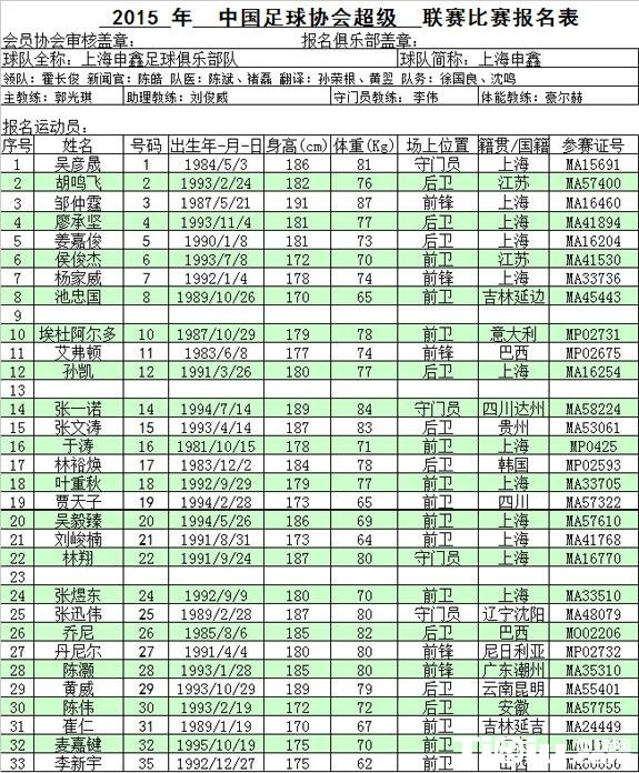 申鑫2015中超报名表 内马尔前队友披10号