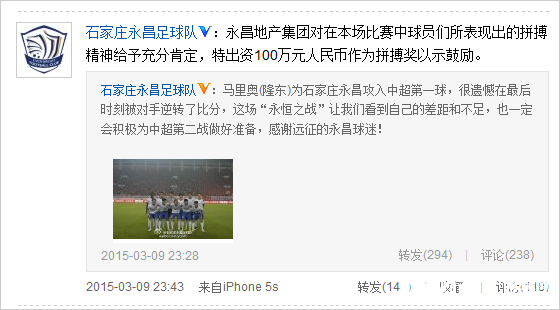 国内足球 时间:2015-03-10 11:42来源:未知编辑:浅月【导读】中超首秀之前,永昌俱乐部曾开出了高达500万的赢球奖和200万的平球奖金,虽然球队最终没能如愿实现逆袭,但赛后永昌俱乐部高层就表态,颁发100万的拼搏奖。