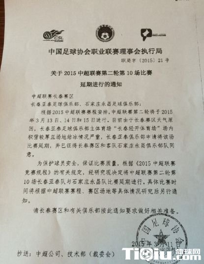 国内足球 时间:2015-03-12 10:19来源:未知编辑:浅月【导读】昨天,中国足协下发通知,因天气原因中超第二轮长春亚泰-石家庄永昌比赛延期,具体延期时间待定。
