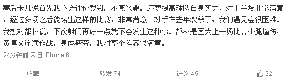 “广州足球新闻”随后透露卡纳瓦罗赛后采访时表示:“首先我不会评价裁判,不感兴趣。还要提高球队自身实力,对下半场非常满意,经过多场之后能踢出这样的比赛,非常满意。对手在去年双杀了,我们遇见会很困难。我想对郜林说,下次射门再好一点就不会发生这种事。郜林是因为上一场比赛小腿撞伤,黄博文连续作战,身体疲劳,我对整个阵容很满意。”