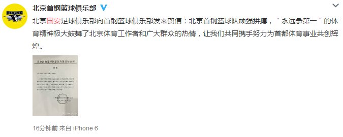 北京首钢男篮微博原文: