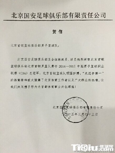 北京国安足球俱乐部及全体教练员、球员热烈祝贺北京首钢篮球俱乐部北京首钢男篮队勇夺2014-2015中国男子篮球职业联赛(CBA)总冠军。北京首钢篮球队顽强拼搏、“永远争第一”的体育精神极大鼓舞了北京体育工作者以及广大群众的热情。让我们共同携手努力为首都体育事业共创辉煌!