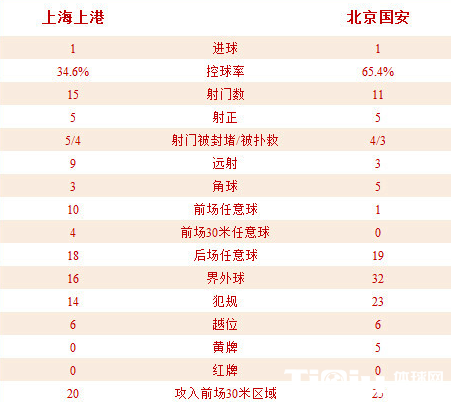 主队上港在控球率上完全处于下风(34.6%VS65.4%),但射门次数上,上港却是15-11领先了4次,双方都有5次命中目标范围的射门。上港在角球次数上落后国安,但前场任意球数量却是10-1完胜,国安更是付出了23次犯规和5张黄牌的代价。攻入前场30米危险区域的次数,上港20-25稍稍落后,从数据上来看,1-1对两队来说是一个合理的结果。