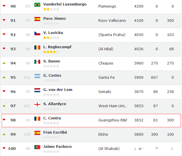 虽然广州富力在上周末客场战胜了长春亚泰,但是孔特拉的排名不升反降,下滑5位,以3832个积分位列第98位,险跌出世界主帅前一百名。国安主帅曼萨诺以3550分排名世界第110位,卡纳瓦罗排名世界第285位,排名比上期上升了40位。从恒大卸任的里皮以1935分排名世界第295位,创下一年来的排名新低。此外,山东鲁能对北京国安的大捷也使得库卡的排名止住了连跌,上升30位,位列第383位。上海上港虽然贵为中超积分榜头名,但埃里克森的排名却在本周下滑,目前埃里克森仅位列第378位。
