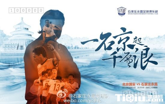 石家庄永昌的比赛海报主题为一石京起千层浪,巧妙取两地简称,海报背景画面则选取了北京天坛,场上是对手,场下是朋友,永昌将士既要在工体掀起惊涛骇浪,也寄望京津冀一体化,携手推动中国足球不断向前。