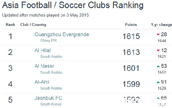 国内足球 时间:2015-05-05 15:59来源:未知编辑:浅月【导读】北京时间5月5日消息,在最新一期的足球俱乐部排行榜中,广州恒大重返亚洲第一。以1615分排在世界第74位,排名再次超越阿尔希拉尔列亚洲第一,不过恒大领先沙特豪门的优势非常微小,仅仅只有2分之差。此外,曾飙至亚洲第10创造俱乐部最佳排名的国安本期排名再次下降,排名亚洲第19,另外一家中超豪门山东鲁能的排名是亚洲第43。