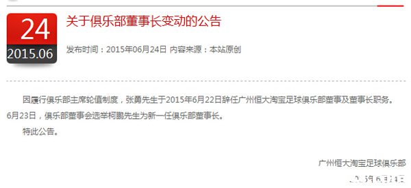 国内足球 时间:2015-06-24 16:43来源:未知编辑:浅月【导读】北京时间6月24日,广州恒大淘宝俱乐部官方发布公告,恒大集团对俱乐部增资,持股上升至60%,阿里巴巴持股40%;另外,张勇辞任俱乐部董事及董事长职务,柯鹏当选新任董事长。