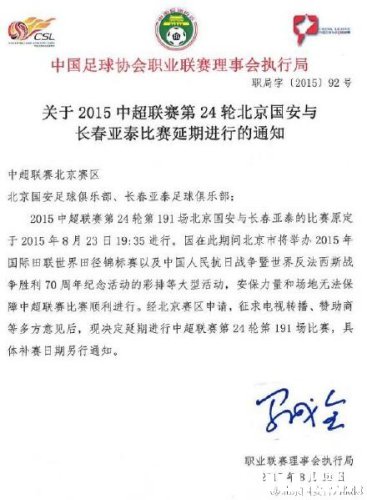 国安主场对阵亚泰比赛延期 补赛时间另行通知
