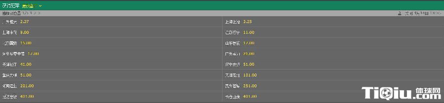天津权健(41.00)、辽宁开新(51.00)、重庆力帆(51.00)3队的赔率相差无几,权健排在第9位,辽足和力帆并列第10。