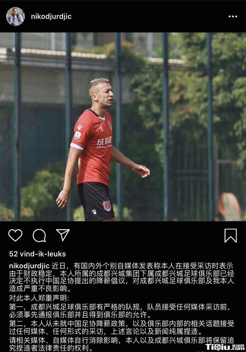 此外,在《久尔吉奇关于某自媒体文章不实报道的声明》中,成都兴城外援久尔吉奇强调,近日,有国内外个别自媒体发表称本人在接受采访时表示由于财政稳定,本人所属的成都兴城集团下属成都兴城足球俱乐部已经决定不执行中国足协提出的降薪倡议,对成都兴城足球俱乐部及我本人造成严重不良影响。