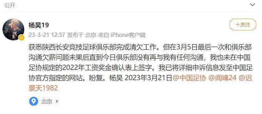 杨昊在社交网络上表示,自己和陕西队3月5日沟通未果后,没有后续的沟通,也没有在工资确认表上签字,这意味着他和陕西队的欠薪仍未解决。杨昊已经将相关的资料发送给中国足协,足协还将进行审核。