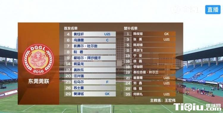 东莞莞联首发:29-樊津铭、4-黄钰轩(U21)、20-汪兴强、6-冯潇霆、14-姚玺龙、26-苏士豪、7-凯赛尔-吐尔逊、8-阮君、23-拉乌尔、9-藏哈尔-拜沙提汗、17-龚秋乐