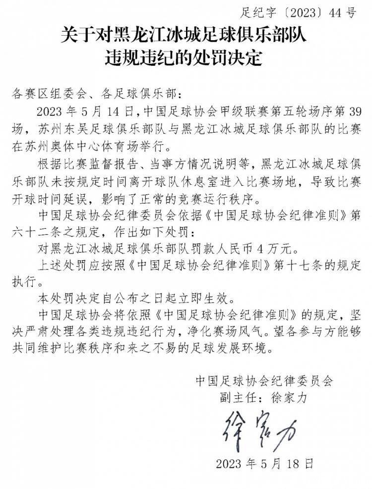 中甲第5轮黑龙江冰城客场对阵苏州东吴的比赛于5月14日晚在苏州奥体中心进行。中国足协纪律委员会的处罚公告显示,黑龙江冰城未按规定时间离开球队休息室进入比赛场地,导致比赛开球时间延误,因此决定对其处以罚款4万的追罚。