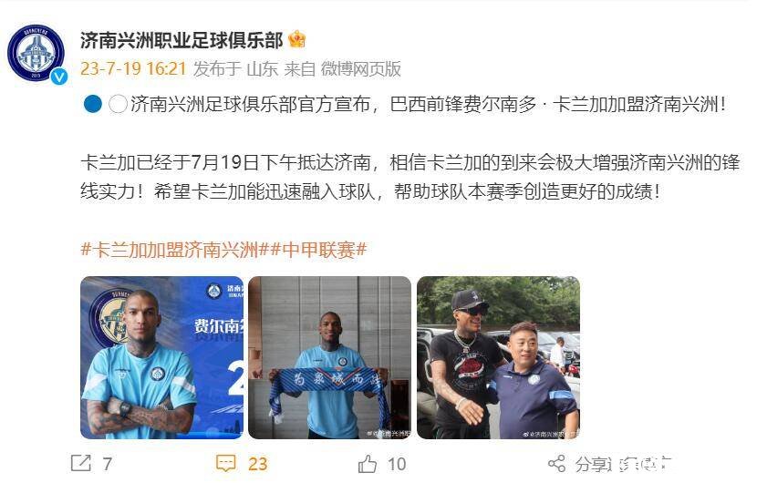 国内足球 时间:2023-07-19 20:00来源:编辑:燕归北京时间7月19日,中甲济南兴洲官方宣布,外援卡兰加正式加盟就对。卡兰加将身穿27号球衣,代表济南兴洲出战中甲联赛,这对兴洲的进攻线是个很大提升,而卡兰加在中国足球职业联赛开打时,是加盟河南队的,但是因为河南队拖欠工资的问题,导致卡兰加的躲避赛事。