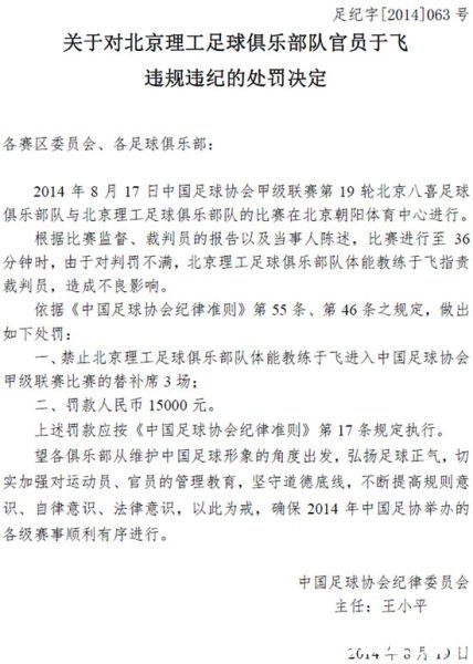 根据比赛监督、裁判员的报告,比赛进行到第36分钟时,由于对裁判不满,北京理工足球俱乐部队体能教练于飞指着裁判员,造成不良影响。