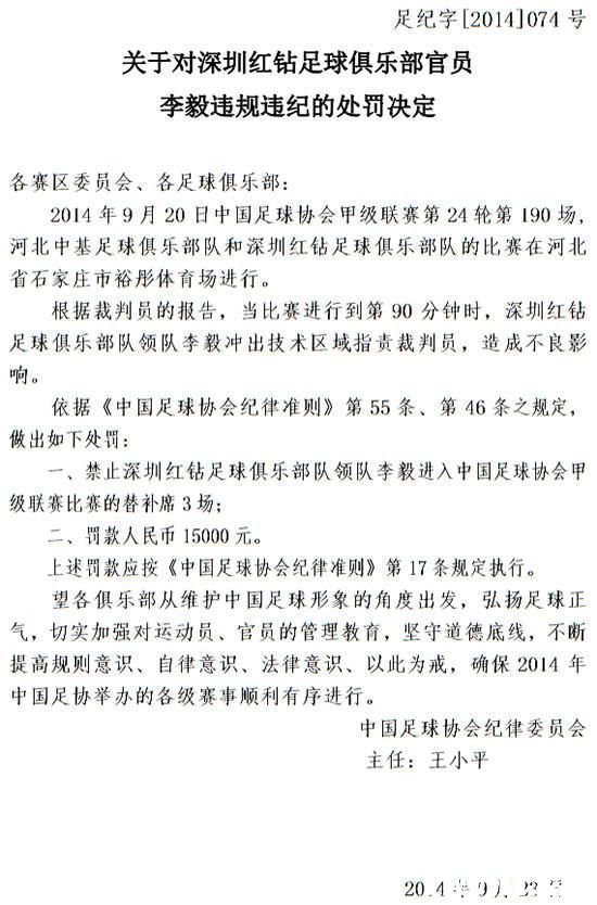 国内足球 时间:2014-09-25 11:12来源:未知编辑:浅月【导读】北京时间9月24日,中国足协公布了对中甲深圳红钻主帅李毅的处罚决定。他因为在红钻与中基的比赛中指责裁判,将被停赛3场及罚款15000元。