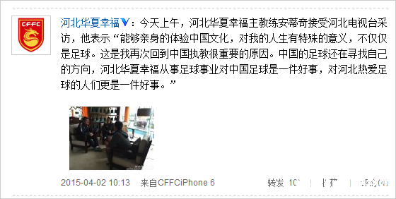 国内足球 时间:2015-04-24 14:33来源:未知编辑:浅月【导读】北京时间4月2日上午,河北华夏幸福主教练安蒂奇接受了河北电视台采访,他表示,重新执教中国球队的目的是想亲自体验中国文化,企业投资足球对中国足球是一件好事。