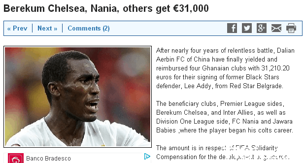 国内足球 时间:2015-04-02 16:57来源:未知编辑:浅月【导读】北京时间4月2日,据加纳媒体《ghanaweb》报道,大连阿尔滨2012年在引进加纳国脚李阿迪时,本应向其青少年时效力的四家加纳俱乐部支付3.1万欧元的青训培养费,然而该费用却被阿尔滨拖欠了4年之久。好在阿尔滨上周在最后通牒前支付了这笔费用,才惊险躲过国际足联的处罚。