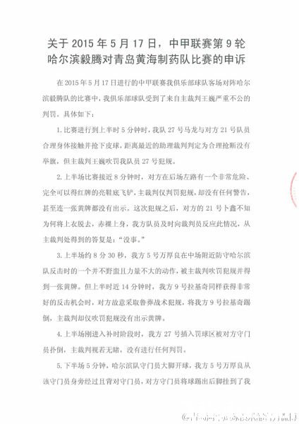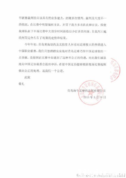 国内足球 时间:2015-05-19 17:22来源:未知编辑:浅月今天中午,针对上轮中甲联赛的判罚,青岛海牛足球俱乐部提出异议,正式以书面形式向足协裁委会提出申诉,同时也剪辑出裁判误判、漏判的视频证据发送给足协。青岛海牛足球俱乐部在申诉中指出了当场主裁判王巍的8次错判、漏判及尺度不一的情况,认为“主裁判王巍的判罚完全左右了比赛的走势和结果”。