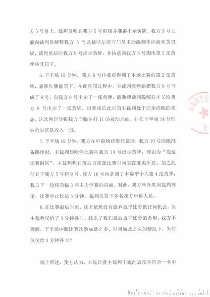 8.在比赛最后时刻,我方依然没有放弃扳平比分的任何机会,但主裁判仅给了3分钟补时,抹杀了我们最后扳平比分的希望。我方不理解,下半场中断比赛次数如此之多、时间如此之久的情况下,为何仅仅给3分钟补时?