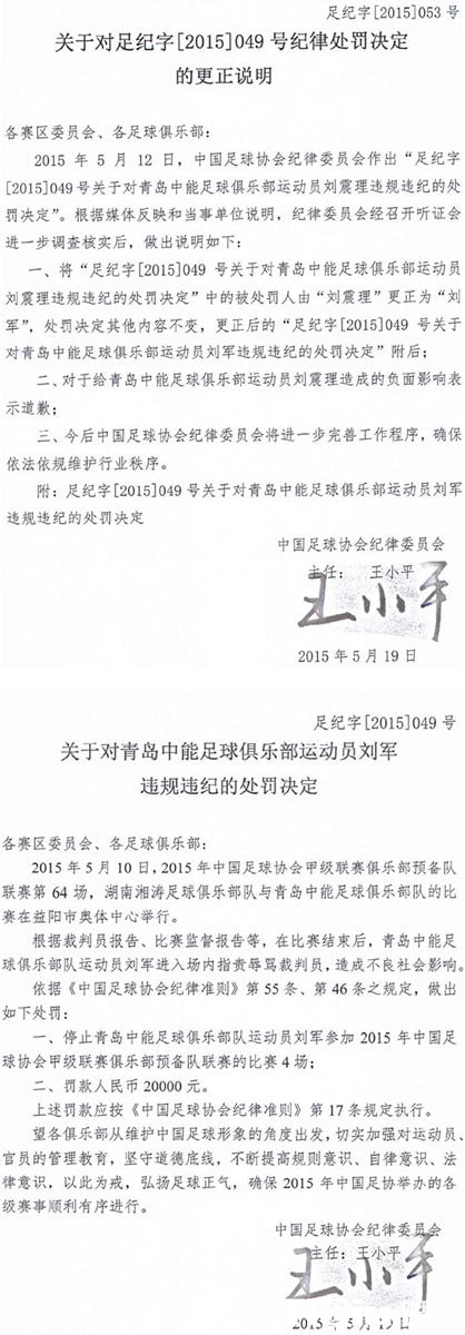 在更正申明中,足协写到:将“足纪字[2015]049号关于对青岛中能足球俱乐部运动员刘震理违规违纪的处罚决定”中的被处罚人由“刘震理”更正为“刘军”,处罚决定其他内容不变。对于给青岛中能足球俱乐部运动员刘震理造成的负面影响表示道歉。