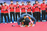 延边俱乐部主任跪谢球迷 200辆车组成欢迎车队15年的等待,15年的追逐,2015年10月18日,延边队在武汉实现了冲超夙愿,重回中国足球顶级联赛。昨天中午,延边足球将士返回家乡延吉,他们受到了英雄般的礼遇,整个城市都在为英雄们欢呼。俱乐部主任朴成雄更是用跪谢的方式来感谢延边球迷。...